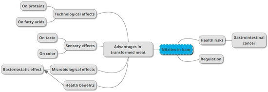 Daily consumption of nitrites may increase the risk of gastrointestinal cancer due to the in vivo formation of nitrosamines. The endogenous formation of N-nitroso compounds in the stomach is complex and depends on several factors, such as gastric pH, bacteria, and the presence of antioxidants [32]. The amount of those components is therefore very complex to evaluate, model, and predict [33]. In addition, the processing and storage of meat can increase the amount of amines available for nitrosamine formation [34]. Therefore, many alternatives have been developed to limit the use of nitrites in cured and processed meat products [35]. Figure 1 illustrates the general risks and benefits associated with nitrite treatment of ham and, more generally, of cooked and processed meat products.
