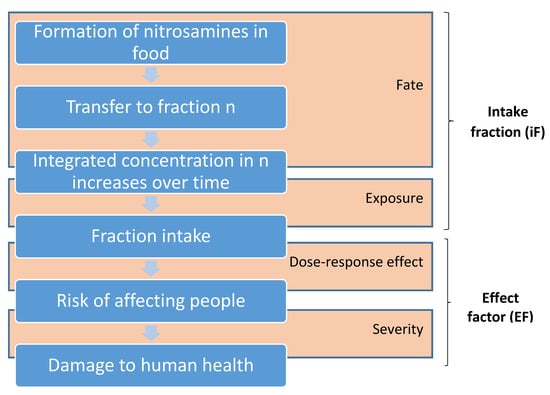 Causality chain of the potential toxicity of nitrosamines via the ingestion of food (inspired by Jolliet et al. 2010 [60]).