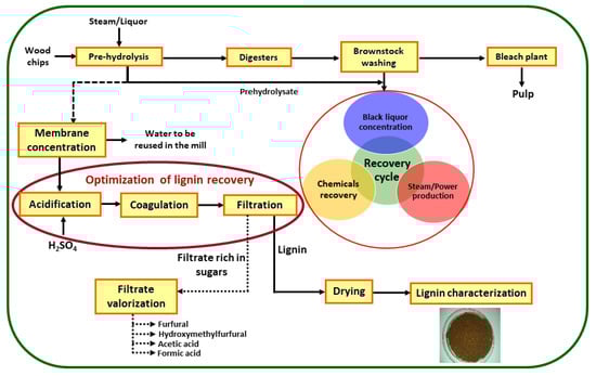 During the last decade, there has been great interest in converting some hardwood kraft pulp mills to dissolving pulp (DP) operations (Figure 1). It has been reported that about 14 pulp mills have announced an increase in DP production or conversion from kraft to DP []. In kraft dissolving pulp mills, a step of pre-hydrolysis (using steam or hot water) is required to remove a significant part of hemicelluloses and lignin in order to produce purer cellulose pulp during subsequent steps. By subjecting wood chips to hot water treatment at about 170 °C and high pressure, the hemicelluloses are hydrolyzed to sugar oligomers and monomers. As a result, the hemicelluloses and part of the lignin present in wood chips are released into solution to form the pre-hydrolysate. This solution is then mixed with black liquor generated at the end of the cooking process. Black liquor has a high calorific value; it is sent to the recovery boilers for burning to produce energy and steam and to recycle chemicals used throughout the process to meet the internal needs of the plant. This high calorific value of black liquor is mainly due to the presence of lignin. The excess lignin can be extracted from black liquor using various techniques, namely acid precipitation, ultrafiltration, and use of organic solvents.