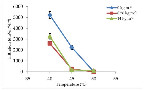 The effects of sulfuric acid concentration and temperature on the filtration rate are shown in Figure 2. In general, there is a significant decrease in filterability as the temperature increases. With no sulfuric acid added, the filterability of the solution after coagulation decreased from 5216 dm3·m−2·h−1 at 40 °C to 2248 dm3·m−2·h−1 at 45 °C and then to 21 dm3·m−2·h−1 at 50 °C. The same tendency was observed with increasing sulfuric acid concentration in a solution from 0 to 14 kg·m−3. It appears that acidification has a negative effect on filterability, and the best condition was observed when no sulfuric acid was added. At 8.6 and 14 kg·m−3 of sulfuric acid, the filterability curves were similar. However, a large increase in filterability was observed when no acidification was applied. It is worth mentioning that, without acidification, the recoverable lignin was only the insoluble lignin in the concentrate. This lignin is characterized by its high molecular weight compared to the lignin that is still soluble in the pre-hydrolysate. This can explain the high filterability obtained when acidification was not applied. The soluble lignin is mainly stabilized because of the repulsive forces due to the presence of ionized phenolic hydroxyl and carboxylic groups. To recover higher lignin quantities, an acidification step should be used in the process. This leads to protonation of the dissociated phenolic hydroxyl groups of the lignin. As a result, repulsive forces decrease and more lignin precipitates []. With acidification, lignin with a lower molecular weight starts to precipitate [], thus leading to a decrease in filterability of the solution. At 45 and 50 °C and after acid addition, the filterability was low, as indicated in Figure 2. At a temperature of 40 °C and any acid concentration, the filtration rate is significantly higher compared to those obtained at temperatures of 45 and 50 °C.
