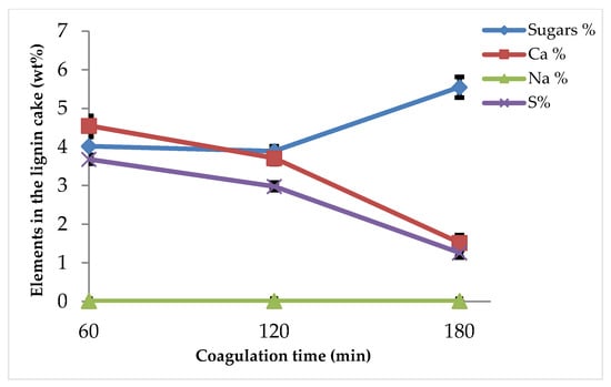Effect of the coagulation time on sugar, calcium, sodium, and sulfur percentages in the lignin cake at a temperature of 40 °C and 8.56 kg·m−3.