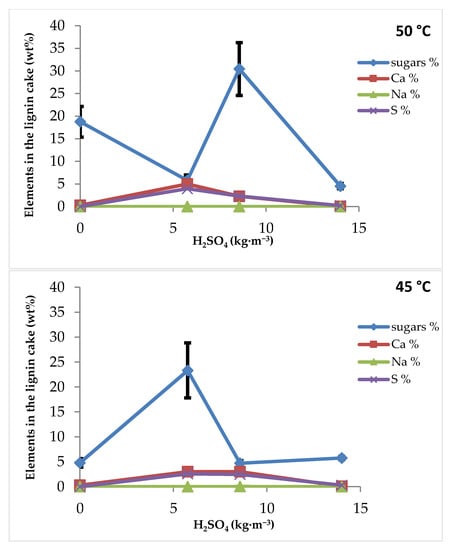 Sugar, calcium, sodium, and sulfur contents in the lignin cake as a function of the sulfuric acid concentration and temperature after 180 min of coagulation.