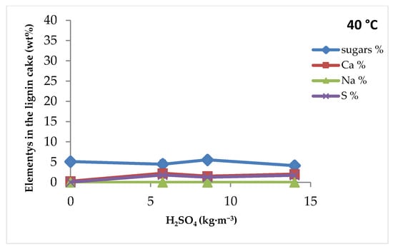 Figure 5 presents the percentages of Na, S, Ca, and sugars in the lignin cake as a function of sulfuric acid in the solution at temperatures of 40, 45, and 50 °C. At 14.7 kg·m−3 of acid, the Ca, Na, and S contents are the lowest at 45 and 50 °C. However, these temperatures are not recommended as the filtration rates are low, as shown in Figure 2. The sugar, Na, Ca, and S contents seem to be almost constant at 40 °C, irrespective of the concentration of the sulfuric acid. Thus, the lowest total impurity level of 8.5% can be achieved at 40 °C and a sulfuric acid concentration of 5.76 kg·m−3 (4.47% sugars, 0.007 % sodium, 1.79% sulfur, and 2.23 % calcium).
