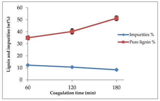 The variation in the percentage of lignin recovery as a function of coagulation time is shown in Figure 6 for experiments conducted at 40 °C. In fact, a recovery of about 35% of the initial lignin was observed using a coagulation time of 60 min. By increasing the coagulation time to 120 or 180 min, lignin recovery increased to 40.3 and 51%, respectively. As the coagulation time is increased, molecules of lignin (which are in suspension) have sufficient time to coagulate and form agglomerates of lignin that are large enough to be retained on the filter cake. At any time, fine lignin particles that did not agglomerate will pass through the cake and the filter. These fine particles are present in a considerable amount when coagulation time is short. A coagulation time of 180 min gave the lowest content of impurities in the lignin cake, as shown in Figure 6. The impurity level was 8.3%.