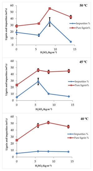 Figure 7 presents the percentages of lignin recovered and the amounts of impurities as a function of sulfuric acid concentration and filtration temperatures of 40, 45, and 50 °C. The highest amount of lignin recovered in this study was 55.4%. It was recovered at 50 °C and a sulfuric acid concentration of 8.5 kg·m−3. However, under the same conditions, the cake also contained more than 35% of impurities. At the same temperature of 50 °C and at other sulfuric acid concentrations (0, 5.7, and 14 kg·m−3), not more than 43% of the initial lignin was recovered. The same observations can be made for the experiments conducted at 45 °C (Figure 7). Even though more than 40% of the initial lignin was recovered, the lignin cake still contained a high percentage of impurities when 5.7 and 8.5 kg·m−3 of sulfuric acid were used. Notably, a low percentage of lignin was recovered when no sulfuric acid was used. Except for the 0 kg·m−3 sulfuric acid concentration, all the other experiments carried out at 40 °C showed a recovery of lignin higher than 45% and a level of impurity less than 8.5%.