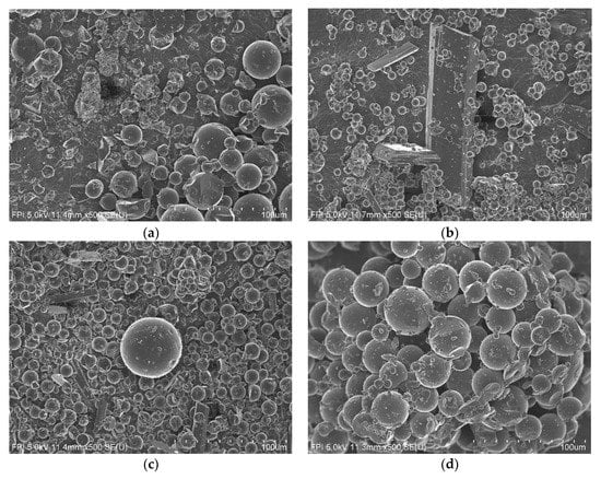 Scanning electron microscopy (SEM) micrographs of lignin obtained (the scale bar is 100 μm): (a) = A1 (40 °C; 14 kg·m−3 H2SO4, 180 min), (b) = A2 (40 °C; 8.5 kg·m−3 H2SO4, 180 min), (c) = A3 (40 °C; 5.7 kg·m−3 H2SO4, 180 min), and (d) = A4 (40 °C; 0 kg·m−3 H2SO4, 180 min).