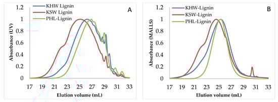 The molecular weight distribution of KSW, KHW, and PHL lignins are shown in Figure 10. It can be seen from this figure that PHL lignin has a significantly lower molecular weight and polydispersity index than KSW and KHW lignins. This was confirmed when both UV (A) and MALLS (B) detectors were used. This can be attributed to a higher fraction of small lignin molecules in PHL lignin compared to KSW and KHW lignins. This is clearly highlighted in the elution volumes shown in Figure 10A: 21, 19, and 18 mL for PHL, KHW, and KSW, respectively. The same trend was observed when the MALLS detector was used. This demonstrates the advantage of pre-hydrolysis treatment (which can be considered a simultaneous depolymerization step) that led to the formation of a lignin with a lower molecular weight and narrower distribution than kraft lignins.