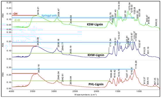 As shown in Figure 11, FTIR spectrums demonstrated that KSW, KHW, and PHL lignins are rich in hydroxyl groups. The big band around 3400 cm−1 is due to the stretching vibration of phenolic and/or aliphatic hydroxyl groups []. The intensity of this band was clearly higher in the case of PHL lignin, indicating the presence of higher hydroxyl group contents compared to KSW and KHW lignins. The absorption peak around 1700 cm−1 is associated to C=O stretching from the aldehyde, ketone, and ester groups [].