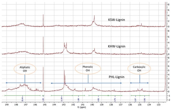 Quantitative 31P NMR spectra for KSW, KHW, and PHL lignins.