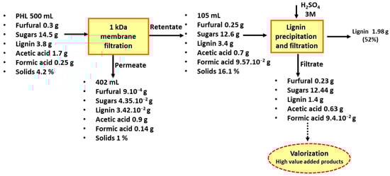 The filtrate obtained after precipitating and recovering lignin (52% of the initial lignin) contains most of chemical products present in the retentate. A valorization step is encouraged to diversify the portfolio of the pulp mill. Since it already contains sulfuric acid (resulting from the lignin precipitation step), a chemical conversion of sugars into a wide range of bioproducts such as furfural and hydroxymethylfurfural could be the most adapted for this case. The best way to valorize the resulting solution (residue) is by sending it to the recovery cycle because it contains the remaining organic bioproducts and lignin. The latter has a high calorific value and could be burned in the recovery boiler to produce energy.