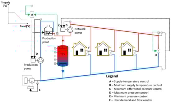 Six independent basic control strategies operate simultaneously in a traditional DH network, as depicted in Figure 1 and listed in the following. These are usually implemented in the form of classical control such as rule-based or PID. According to Frederiksen and Werner (2014) [], the ones from A to E are implemented at the production and pumping station level, whereas the control strategy F is implemented at the user substation level.