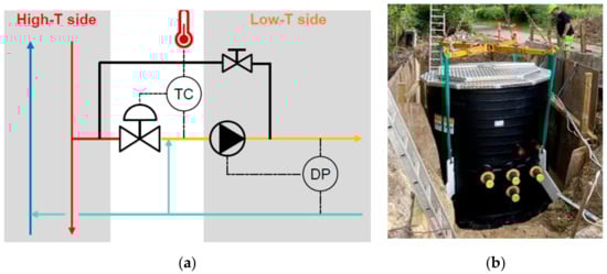 (a) Piping & instrumentation diagram of the mixing station installed at the DH system of Brescia []; (b) shunt system installed in the district heating and cooling (DHC) system of Albertslund [].