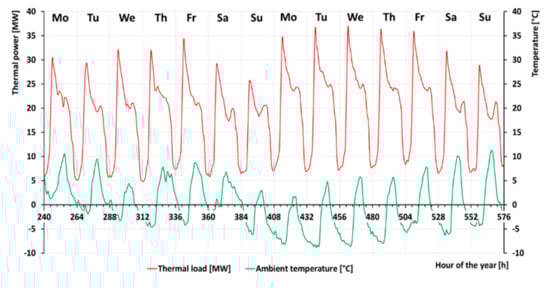 To satisfy the users’ comfort, the heat load must be met almost instantaneously with the consequence that DHC systems are usually demand-driven. Since the heat load of the entire DHC system is the result of the aggregation of the heat demand of every single building plus the network distribution thermal losses, it is affected by less variability concerning the heating/cooling demand of every single building. Nevertheless, it is characterized by a seasonal variation, weekly variation between workdays and weekends and a daily one. For instance, the daily and weekly variations for the heat load of a DH system located in Northern Italy during two consecutive weeks in the winter period are shown in Figure 3. Both variations are a consequence of the collective social behavior, such as harmonized working hours, leading to the result that the heat load during weekend days is lower with respect to one of the weekdays. The daily load variation is characterized by two peaks: one in the morning and one in the afternoon. Nevertheless, the night setback control used to cover the space heating (SH) demand makes the morning peak higher than the afternoon one. It aims to shut down the heating system or adopt a lower room temperature setpoint during the night with a time-clock operation that can have the same settings in several buildings. When the DH substation starts its operation, the superposition of two contemporary side effects occurs: a very high flow rate on the primary side, since the valve is fully opened to meet the temperature set point at the secondary circuit, and a peak in the differential temperature on the primary side, because even if the supply temperature on the secondary side increases, the return temperature is still shallow until the building heating system reaches a more steady-state condition.