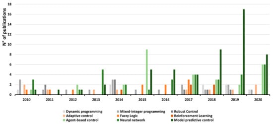 The implementation of advanced control strategies in DHC systems is challenging, since they are affected by time-varying nonlinear dynamics, time-varying set-points and disturbances. Likewise, the implementation in HVAC systems, advanced control strategies applied in DHC can be classified as hard, soft and hybrid control [,,,]. In the following, some more details are provided about hard and soft implementation of model predictive and agent-based control strategies highlighting their strengths and weaknesses. The focus by the authors on these two main approaches is motivated by a bibliographic study that show the growing number of publications related to the application of these control approaches in DHC systems between 2010 and 2020. The bibliographic analysis, whose results are plotted in Figure 4, has been performed through the database Scopus considering both peer-reviewed and conference papers. The results are also listed in Appendix A with the string used to query the database. It is also evident the growing number of works related to applications of neural networks, whereas in very few cases, robust control and reinforcement learning have been studied.