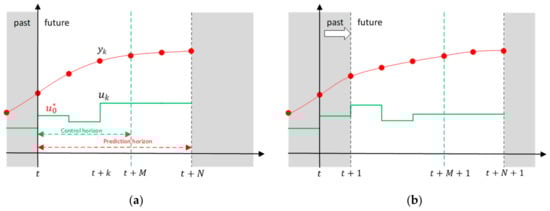 MPC can be considered a cutting-edge technology for improving the operation of DHC systems. It requires a surrogate model of the plant that it is used to simulate the behavior of the system in a dynamic optimization problem. The latter is implemented to minimize a cost function in a receding horizon fashion. This methodology consists of a time window that moves forward by one time-step at each control timestep t according to the schematic shown in Figure 5. The length N of this time window is constant and called prediction horizon. It represents the future time interval in which the outputs of the model (y(t)) are forecasted according to the trajectory of inputs received (u(t)). In order to speed up the optimization algorithm, some “blocking” methodologies can be applied. For instance, according to Figure 5, one can adopt a control horizon (M) that is shorter than the prediction horizon (N). In this way, the last value of the control variable in the control horizon is kept constant and used for the rest of the simulation. Only the first element (u0*) of the optimal input trajectory provided by the optimization algorithm is sent to the plant, whereas the rest is discarded. The optimization process restarts again at the next control timestep after updating the state of the surrogate model with monitored data.