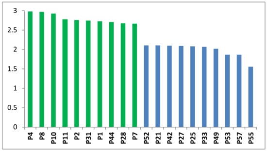 The least popular practices, with a median score of 1.5 to 2.1, are: P21 “Avoiding throwing away waste cooking oil”, P25 “Collection and delivery of glass containers to appropriate collection points”, P27 “Collection and delivery of used batteries, light bulbs to appropriate collection points”, P33 “Throwing away kitchen garbage after it has dried”, P34 “Using receptacle instead of plastic bag”, P42 “Choosing goods with their CO2 emission in mind (carbon footprint)”, P49 “Joining the one day without car program”, P52 “Reducing idling of the car”, P53 “Maintaining the air pressure in the tire”, P55 ”Using the dishwasher” и P57 “Using residual heat when cooking on an electric stove” (Figure 1).