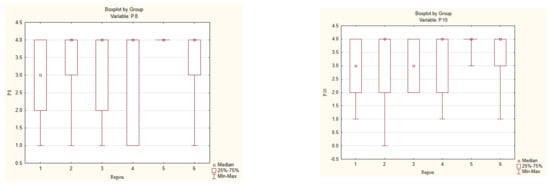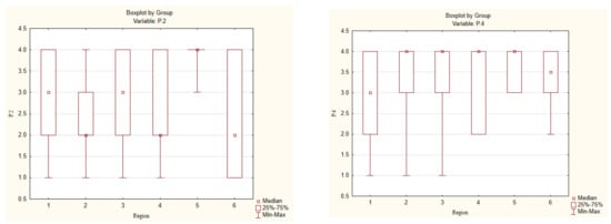 Control over opening the refrigerator (P2): in Krasnodar, this practice is used less frequently (median 2.0, which corresponds to the answer “rarely”) than in Moscow and small towns of the Krasnodar Territory (median 3.0, which corresponds to the answer “often”). Cooling hot food before placing it in the refrigerator (P4): in Krasnodar and Krasnodar region it is used more often (median 4, which corresponds to the answer “always”) than in Moscow (median—3, which corresponds to the answer “often”) (Figure 3). Air conditioner filter cleaning (P6) is used much more frequently in Moscow (median 3, which corresponds to the answer “often”) than in Krasnodar and Krasnodar region (median 2—“rarely”). Air conditioner temperature control (P7) is more often used in large cities—Moscow and Krasnodar (median 3—“often”), and in Krasnodar region-less often (median 2—“rarely”) (Figure 4).