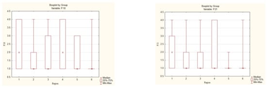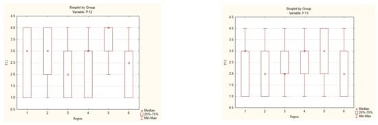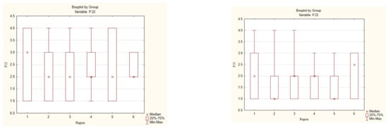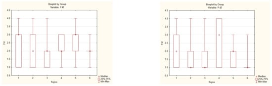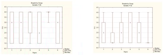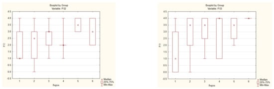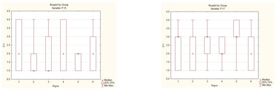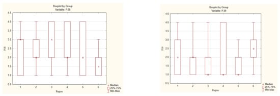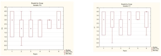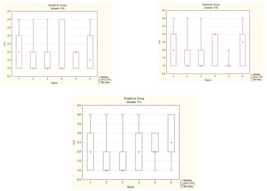 The revealed differences were analyzed by constructing box and whisker diagrams, reflecting the median, and quartiles of 25%–75% and the maximum and minimum values of each group’s respondents’ ratings. Differences due to the discrepancy between only the quartiles of 25–75% and the discrepancy between the median estimates of only groups 4, 5, and 6 (the smallest, cannot be generated randomly) were excluded from the meaningful interpretation. In those cases, when the median values of the most numerous groups of respondents (1, 2, and 3) differed among themselves, we attempted to analyze and substantively explain the statistically significant differences revealed. In Figure 3, Figure 4, Figure 5, Figure 6, Figure 7, Figure 8, Figure 9, Figure 10, Figure 11, Figure 12, Figure 13, Figure 14, Figure 15 and Figure 16 are box and whisker diagrams with the most noticeable differences in the respondents’ assessments between groups 1—Moscow, 2—Krasnodar, 3—Krasnodar region.