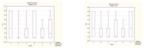 Compliance with waste management standards (P22) is much more common in Moscow (median 3—“rare”) than in Krasnodar and Krasnodar region (median 2—“rare”). Judging by the assessments of respondents from regions with a low representation, it can be expected that the same situation of ignoring waste management standards is observed in other regions of Russia. The practice of sorting waste (P23) is more often used in Moscow and small towns of the Krasnodar region (median 2—“rarely”) than in Krasnodar (median 1—“never”) (Figure 9).