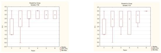The purchase of organic products (P38) is more common in Moscow and small towns of the Krasnodar region (median 3—“often”) than in Krasnodar (median 2—“rare”). The purchase of processed goods (P39) is sometimes found in large cities—Moscow and Krasnodar but not at all in small towns of the Krasnodar region (median 1—“never”) (Figure 13).