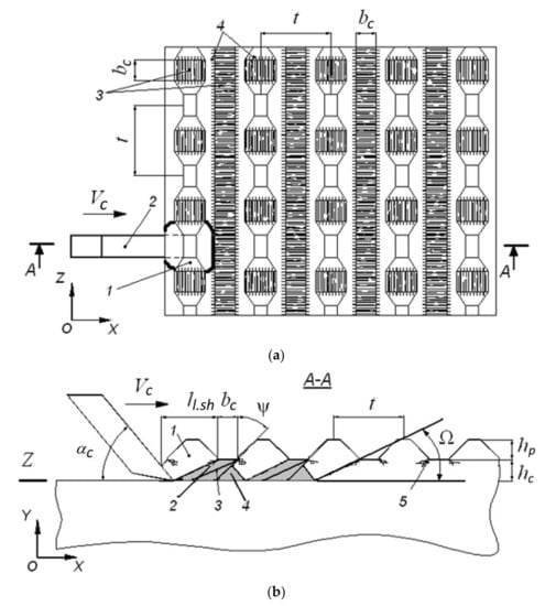 Regular protrusions of a stable shape are formed between co-directional cuttings at t ≤ tr.s.. Displacement of the cutter by a cutting step t entails the separation of one large cleavage from the mass when the cross cutting pattern is implemented (Figure 1, position 1). The frequency of occurrences of large cleavages f1 (Hz) at a constant cutting speed Vc is determined by Equation (3):