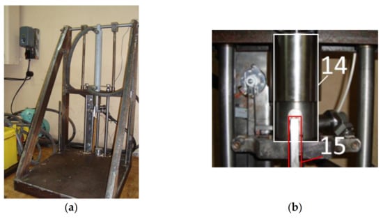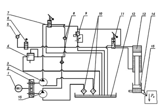 The bench hydraulic system (Figure 3) consists of two gear-type pumps 3 and 16 driven by a three-phase asynchronous motor 1 through a gearbox 2. The actuating fluid is supplied from an oil tank 12 into the cavities of the power hydraulic cylinder 13, the rod of which is connected to the measuring hydraulic cylinder 14 and the cutter 15. The piston diameter of the measuring hydraulic cylinder is 40 mm. The direction of movement of the cutter is determined by switching a spool 11, and the speed of the translational motion is controlled by a flow regulator 9.