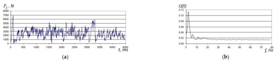 A pressure indicator is connected to the cylinder 14 (see Figure 3), where the pressure is proportional to the cutting force Pz. The feed rate of the cutter 15 is controlled by a displacement indicator—an encoder. The sampling rate of the indicators is 0.5 kHz. Data from the measuring indicators is recorded and converted by a multi-channel AD/DA encoder and processed on a personal computer by specialized software using well-known methods of mathematical statistics, correlation, and spectral analysis.