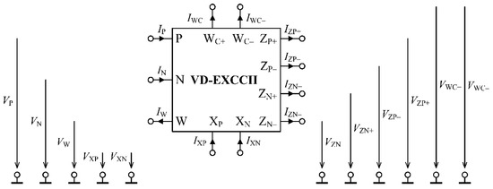 The proposed Voltage Differencing Extra X current conveyor (VD-EXCCII) is derived by connecting extra X second generation current conveyor (EXCCII) [42] and operational transconductance amplifier (OTA). The first stage comprises of OTA followed by the CCII with two current input terminals. The developed active element has characteristics of CCII and tunable OTA in one structure. The voltage-current (V–I) characteristics of the developed VD-EXCCII are presented in Equations (1)–(4) and the block diagram is presented in Figure 1.