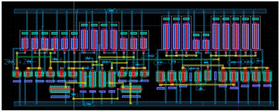 To validate the proposed mixed-mode filter, it was designed and simulated in Cadence Virtuoso design software. The VD-EXCCII was designed in 0.18 µm Silterra Malaysia technology at a supply voltage of ±1.25 V. The width and length of the transistors used are given in Table 5. The layout of the VD-EXCCII as presented in Figure 6 was drawn using the nhp and php high-performance MOS transistors from the Silterra library, and the layout verification was done using the Calibre tool. The layout occupied a total area of 54.28 × 22.80 µ. The bias current of the OTA was fixed at 120 µA resulting in transconductance of 1.0321 mS. The important design parameters were extracted from post-layout simulations and are summarized in Table 6.