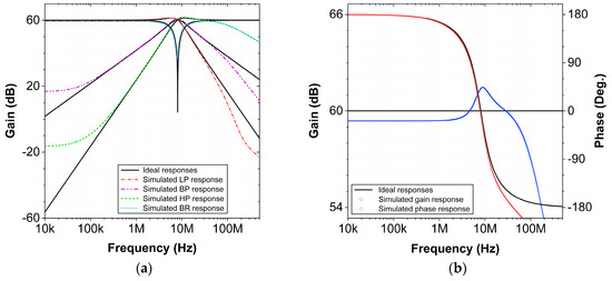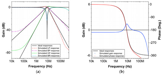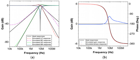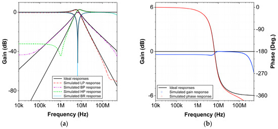 The Equations (17) and (18) imply that when the frequency is varied, the quality factor of the filter will be slightly affected. The frequency can be tuned without affecting the quality factor if and are varied simultaneously such that the product remains constant. The resistor can be realized using a MOS [44] transistor, making it easily tunable.