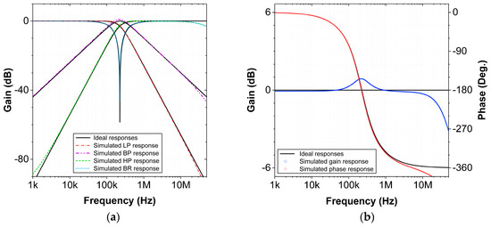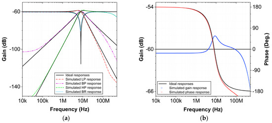 TIM MISO configuration: (a) frequency responses of the LP, BP, HP and BR filter and (b) gain and phase responses of the AP filter.