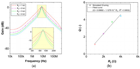 CM MISO configuration: (a) frequency responses and (b) quality factor tuning for different resistor values in BP filter.