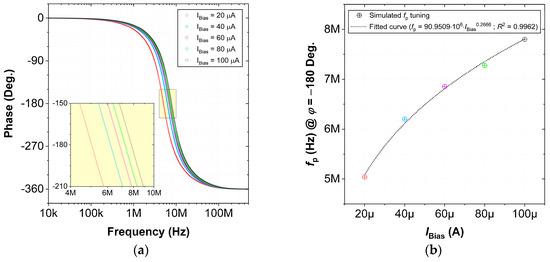 VM MISO configuration: (a) phase responses and (b) pole frequency tuning for different OTA bias current values for AP response.