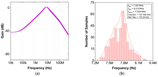 To study the effect of process spread and the non-idealities of the capacitors employed on the performance of the designed filter, a Monte Carlo analysis is carried out for 200 runs. The Monte Carlo analysis results for the VM BP response are given in Figure 14. The results for CM AP configuration are given Figure 15. Corresponding histograms demonstrate the variations of the pole frequency at −180°. The results indicate that the frequency deviation of the filter is within acceptable limits. This further validates the robustness of the design.