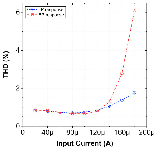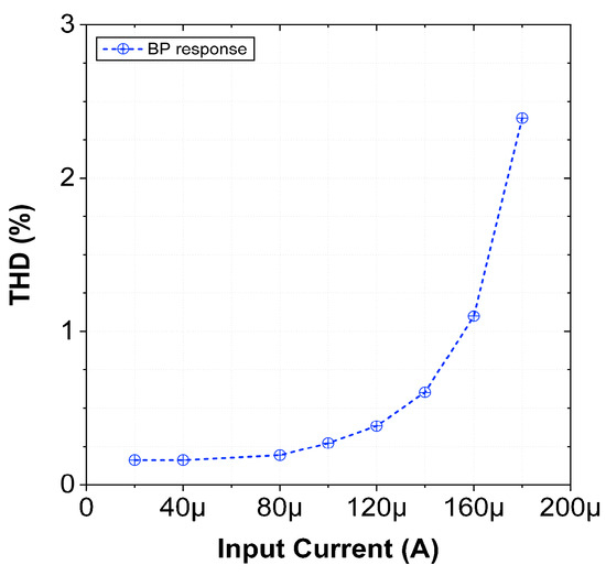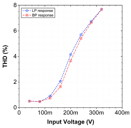 The total harmonic distortion (THD) of the filter for LP and BP responses is plotted for different input signal amplitudes for VM as shown in Figure 16. The THD plot for CM-BP/LP is presented in Figure 17. The THD remains within acceptable limits (≤7.5%) for appreciable input range.