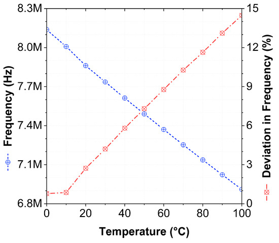 where is the mobility temperature exponent considered as a constant approximately equal to 1.5. The Equations (38) and (39), show that the threshold voltage () and mobility () exhibit a negative temperature dependence which explains the decrease in frequency with temperature, as shown in Figure 18 for CM AP response.