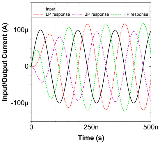 To examine the signal processing capability of the proposed universal filter, the transient analysis was carried out in VM mode for HP, LP and BP responses. A VM sinusoidal signal of 100 mVp-p and a frequency of 8.0844 MHz was applied at the input, and the output was analyzed as presented in Figure 11. It can be inferred from the figure that the phase relation between the input and LP, BP and HP outputs of the filter are correct.
