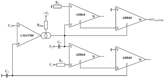 In this mode of operation, all input currents () are set to zero. The input voltages () are applied as per the sequence given in Table 3. The filter transfer functions and expression for pole frequency and quality factor are given in Equations (15)–(18):
