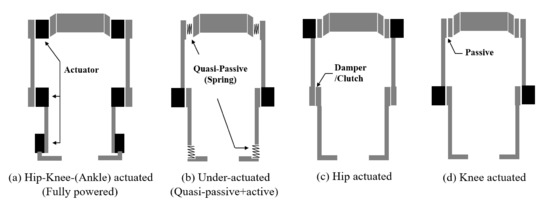 A brief classification of powered exoskeleton gait orthosis systems: (a) Fully powered exoskeleton with hip knee or hip knee ankle actuation; (b) Quasi passive exoskeleton with actuated or damped knee joint where the hip and ankle joint are connected with spring components; (c) Hip actuated exoskeletal gait orthosis with a clutch or damped knee joint; and (d) Knee actuated exoskeletal gait orthosis with passive hip joint.