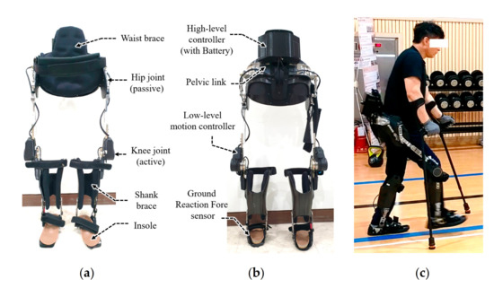 The human knee joint plays an important role in performing most daily activities, such as sitting, standing, and walking. In particular, when the range of the knee’s motion is limited during walking, the patient’s metabolic cost increases because unnatural movements such as hip elevation are accompanied by compensation [12]. Yu et al. have reported that the foot swing acceleration of the active knee joint system is larger than that of the active hip joint system in the swing section after toe-off [13]. Based on these findings, the following two hypotheses were established. Firstly, by assisting the force that accelerates the body forward while walking through knee joint actuation, the user’s metabolic cost can be reduced, and the walking speed can be improved. Secondly, in general, a crutch is an assistive weight-bearing device for propulsion by patients using their arms when walking, but it causes pain in the arms and shoulders with a large energy expenditure [14,15]. Therefore, if the propulsion force is assisted by knee actuation, it is expected that the shoulder and hand pain will be reduced by lowering the dependence on the crutches.