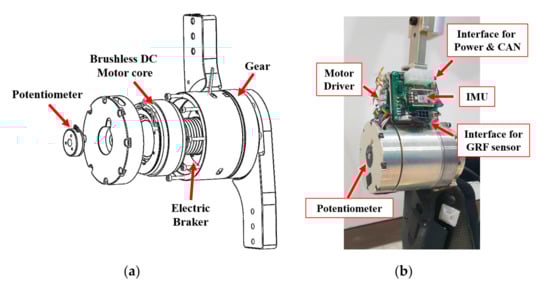 The low-level motion controller is an integrated control module that includes a motor driver and various sensor interfaces and performs torque control of the knee actuation module. In addition, it acts as a sensor interface that transmits the knee and hip joint angle measured from the potentiometer and the inertial measurement unit (IMU), the ground reaction force (GRF) sensor signal, and the motion status parameters of the actuator to the high-level controller through the controller area network (CAN) interface.