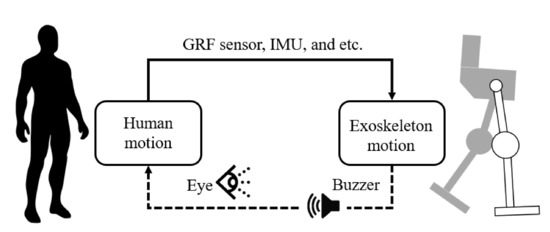 The applied human–machine synchronization concept. The exoskeleton system detects human motion using several sensors, but the person can indirectly detect the exoskeleton’s motion by the buzzer sound and visual feedback.