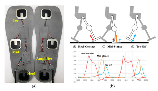 In the exoskeleton system, the GRF sensor is related to the wearer’s gait pattern and is widely used because it can directly detect the presence or absence of contact between the foot and the ground [12]. As shown in Figure 5, we developed a GRF sensor module with three load cells attached to the rear foot, mid-foot, and forefoot areas to detect changes in heel contact, mid-stance, and toe-off. The toe and heel signals were designed to have a temporal deviation according to the ground condition around the mid-sensor. For example, on flat ground, the heel signal was temporally ahead of the mid, but when going up a slope, the toe signal was temporally ahead of the mid. The load-cell sensor applied to measure GRF was a half-bridge type low-cost sensor that could measure up to 50 kg each and had repeatability of 0.05 FS.