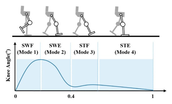 In general, walking can be divided into stance and swing sections. In a normal person, walking is clinically divided into several stages, as needed [12]. In this study, to develop a simple and predictable gait control protocol, as shown in Figure 6, the gait mode was classified into four functional modes (SWF: swing flexion, SWE: swing extension, STF: stance flexion, and STE: stance extension).