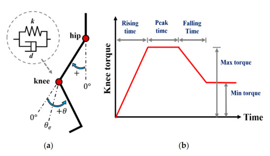 Control model for the knee joint. (a) A simple passive impedance model and the joint angle direction, and (b) The user-customized torque profile.