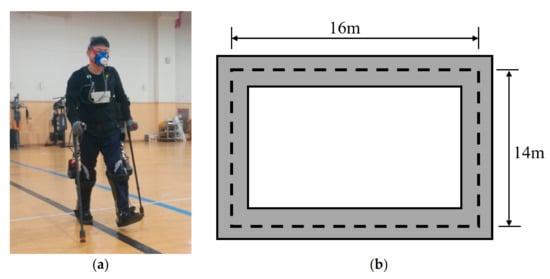 The 6 min walking test to compare the metabolic cost between EGO and KAEGO. (a) Walking test for measuring the subject’s oxygen consumption VO2 and heart rate using K4b2, and (b) 60 m track used for the walking test.
