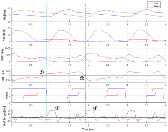 Figure 10 shows the real-time data for 4 s in the walking test with the maximum knee assist torque set to 100% of the rating. The data confirmed that the proposed gait assist control protocol was well performed. The vertical lines ➀ and ➁ indicate the timing of switching to the right and left swing mode (SWF), respectively. The transition from the stance to the swing session was determined based on the movement of the center of gravity and the hip joint position. The movement of the center of gravity was recognized from the differential signal between the left and right GRF (MH). The pre-defined flexion and extension torque of the knee joint, based on the patient’s condition in the swing session, are represented by ➂ and ➃, respectively.