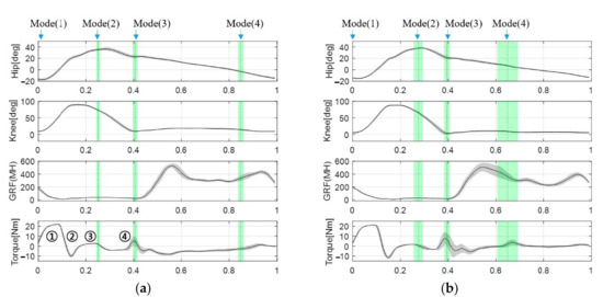 Normalized GRF, control torque output, and joint motion variation during a gait cycle. Vertical dotted lines and the shaded area represent the mean and standard deviation of the gait mode transition timing. Numbers ➀➁➂➃ represent flexion torque, damping torque for knee flexion, extension torque, and the damping torque for knee extension, respectively. (a) the left side gait cycle, and (b) the right side gait cycle.