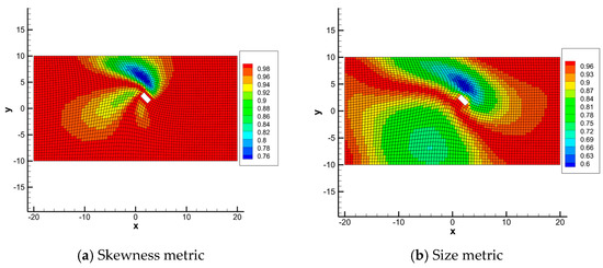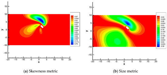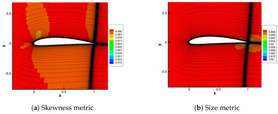 Figure 9 shows the deformed mesh around the airfoil and Figure 10 presents the mapping-based metrics calculation results. Elements near the airfoil have a high-size metric value larger than 0.94, indicating that the area change of these elements does not exceed 6%. Elements with a low-size metric value are in the region above and below the airfoil, especially in the region above the airfoil, as shown in the blue area in Figure 10b. This is mainly because the displacement above the airfoil is the largest over the domain, resulting in large compression of the elements. The value of the skewness metric of elements near the airfoil is larger than 0.99, which indicate that these elements are almost not distorted. Both the size metric and skewness metric are larger than 0.82 and the mesh deformation method is applicable for 2-D mesh deforming of an airfoil large angle rotation. The mapping-based metrics can describe the quality of the mesh deformation method very well.