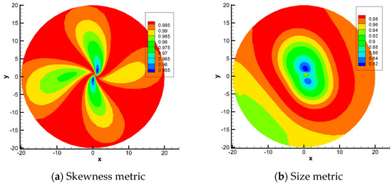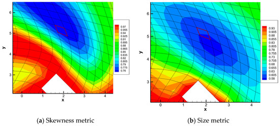 The mapping-based metrics proposed in this paper are used to evaluate the mesh deformation algorithm. Figure 3 shows the skewness metric and size metric over computational domain. It can be seen that the blue area is of the minimal value of quality metrics, which means the elements undergo the greatest compression and distortion over this domain.